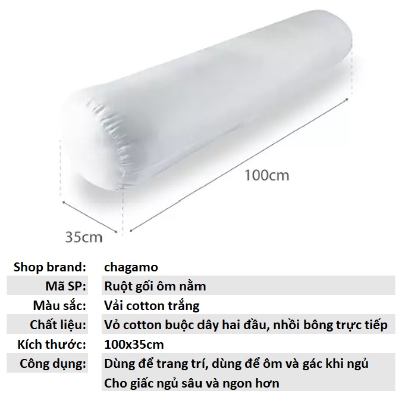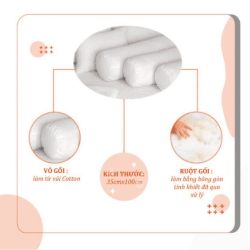 - Kích thước của ruột gối ôm bông gòn tinh khiết tiêu chuẩn vừa vỏ 35cmx100cm, dễ dàng Mix phối với các loại vỏ