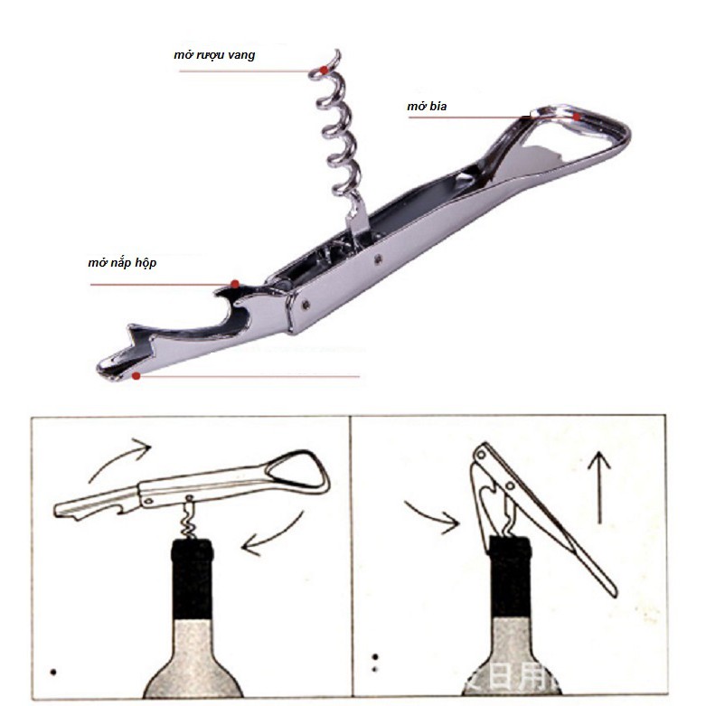 - Công dụng: Dùng khui mở rượu vang, mở bia ... đa năng