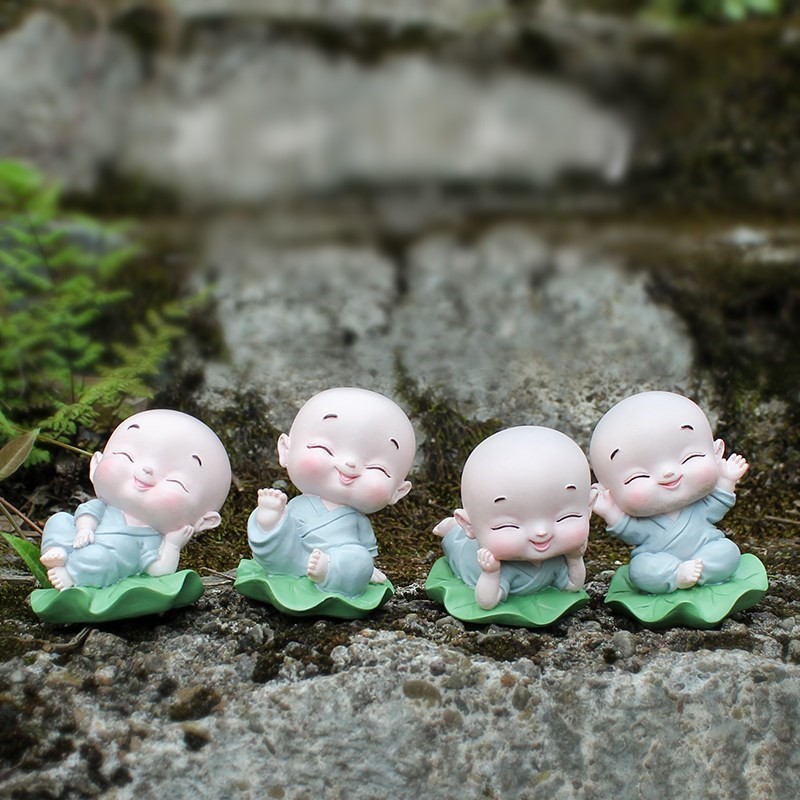 Bộ Tượng Tiểu Trên Lá Sen Xanh Trang Trí Ô Tô Tiểu CảnhBộ sàn phẩm gồm các chú tiểu ngồi lá sen