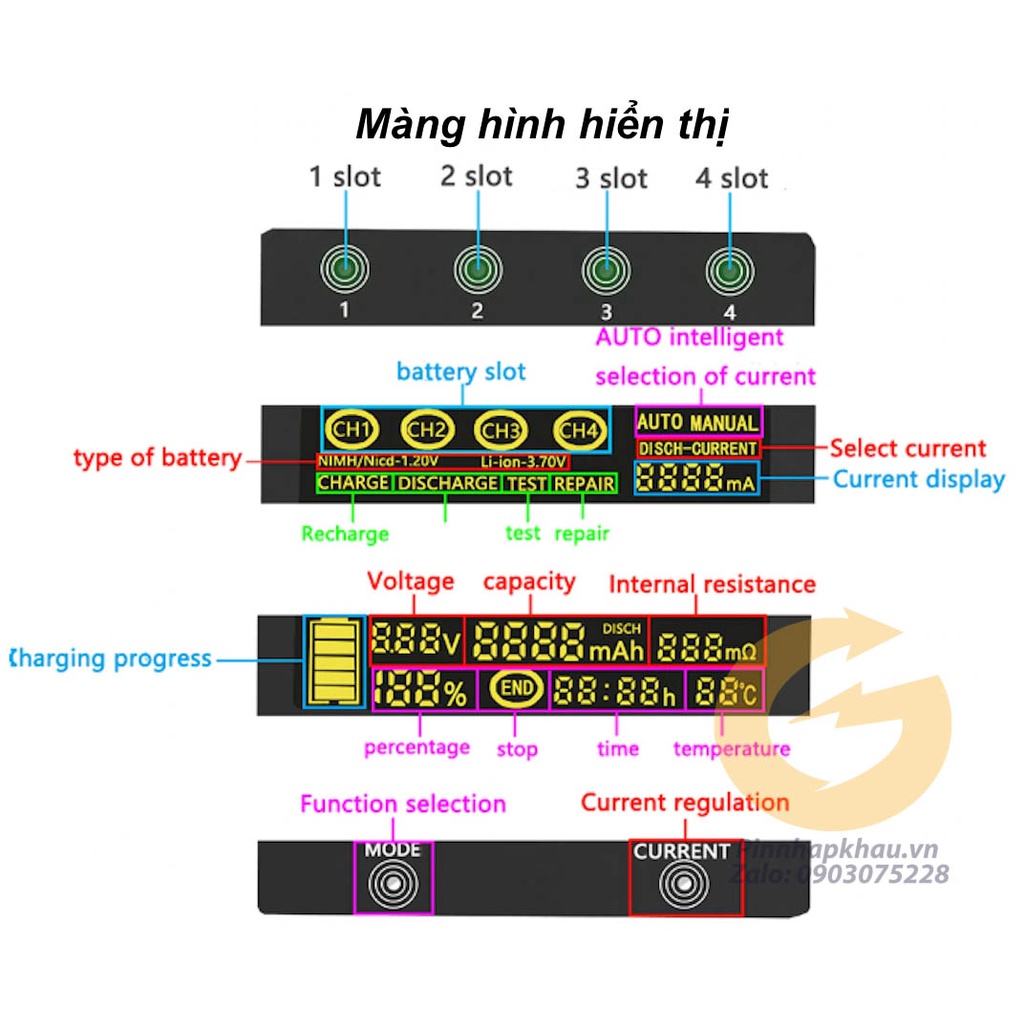 7. Sử dụng màn hình LCD. Chứa loại pin (Li-ion-3.7 V, Ni-MH1.2 V), hoạt động (TỰ ĐỘNG / CHỈNH TAY), kênh pin (CH1-CH4), chế độ làm việc (SẠC PIN / XẢ PIN / KIỂM TRA DUNG LƯỢNG PIN /CHẾ ĐỘ SỬA CHỮA), dung lượng SẠC và XẢ (mAh), thời gian SẠC và XẢ (h), dòng điện SẠC và XẢ (mA), điện áp pin (V),% pin, điện trở bên trong pin (m Ω) ℃, nhiệt độ và các thông số khác, chi tiết và rõ ràng;