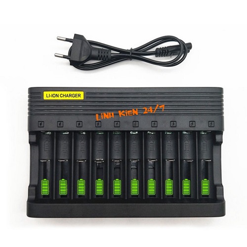 Tính năng sản phẩm:- Bộ sạc 10 pin đa năng, sạc pin lithium 3.7V 14500, 16340, 18650 hay bộ sạc 10 khe, sạc 10 cell, thích hợp sử dụng cho các loại pin Lithium thông dụng.