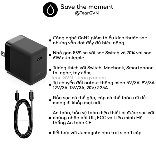 -Công nghệ GaN2 giảm thiểu kích thước sạc nhưng vẫn đạt đầy đủ hiệu năng.-Nhỏ gọn 58% so với sạc Switch và 70% với sạc 61W của Apple. Đầu sạc có thể gập, cáp có thể tháo rời dễ mang đi khắp mọi nơi.