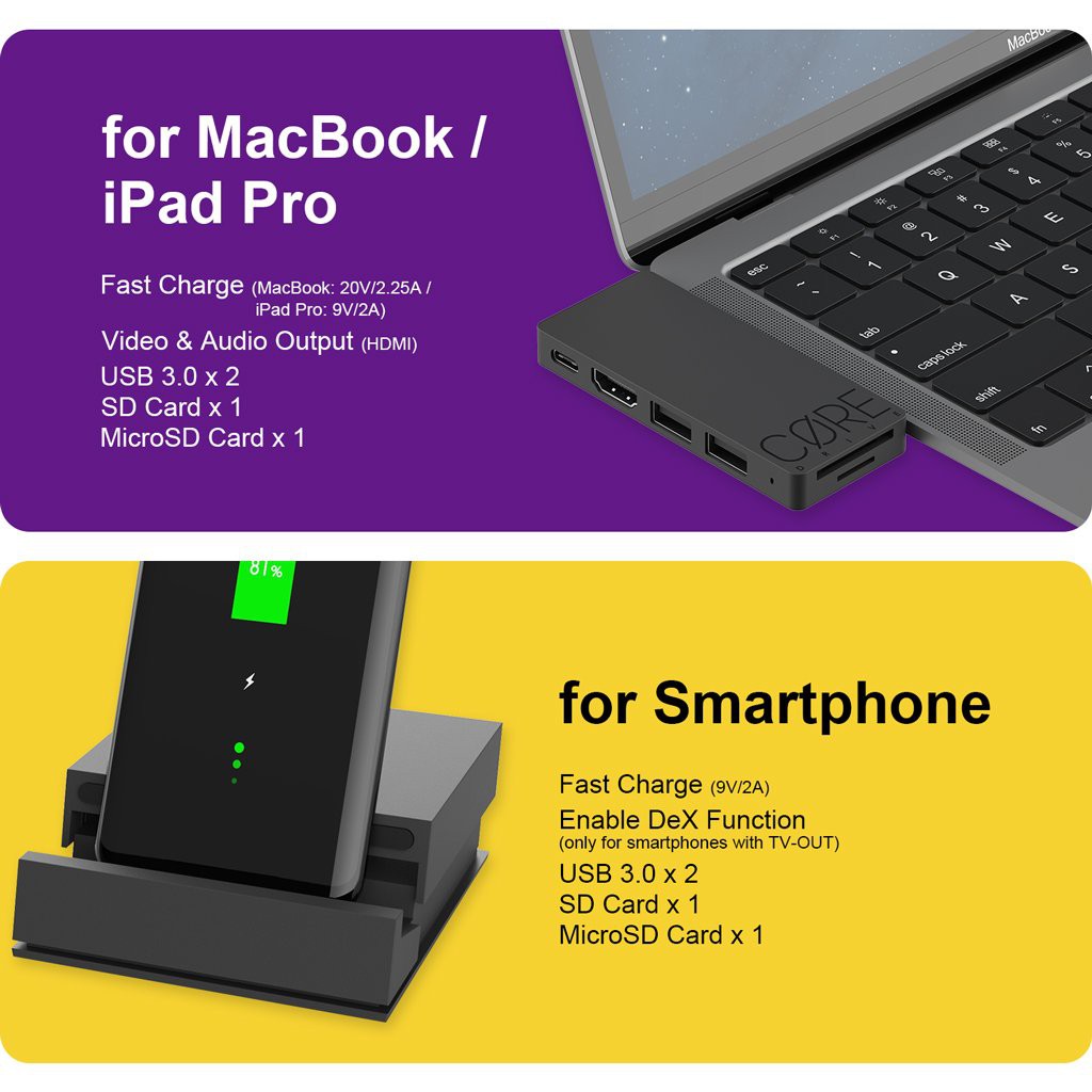 Một Core Drive có thể tháo rời (bộ chuyển đổi mini) cung cấp tất cả các cổng cần thiết, hoạt động với không chỉ Nintendo SWITCH mà còn cả máy tính xách tay và điện thoại thông minh.