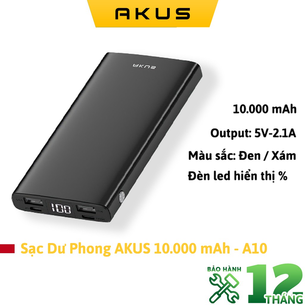 Điện Thoại & Phụ Kiện > Phụ kiện > Sạc dự phòng & Pin > Sạc dự phòng || Sạc Dự Phòng AKUS 10.000 mAh có đèn led điện tử - A10 (Hàng chính hãng - Bảo hành 12 tháng)Còn hàng