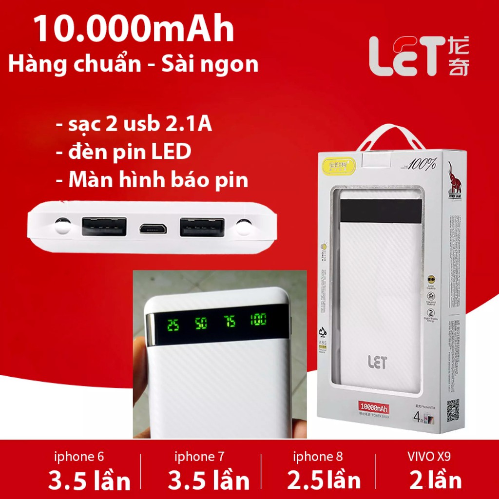Chính hãng LET, Dung lượng 10.000mAh chuẩn