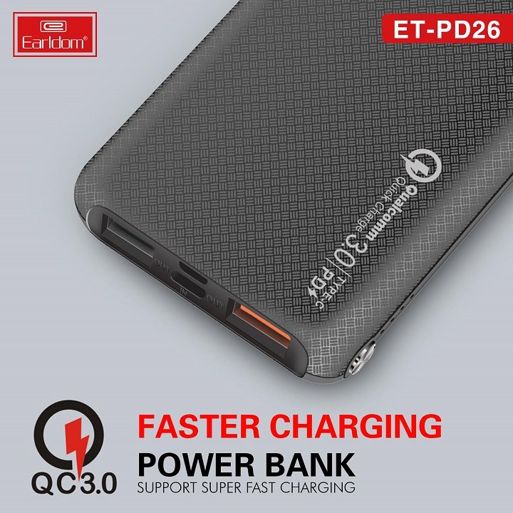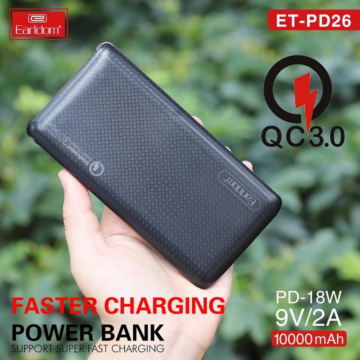 Sạc Dự Phòng 10.000mAh Earldom PD-26- Với nhu cầu về năng lượng ngày càng cao của người tiêu dùng và cùng với sự phát triển mạnh mẽ của công nghệ sạc nhanh, trong thời gian mới đây hãng phụ kiện và đồ chơi công nghệ Earldom Việt Nam cho ra đời dòng sản phẩm Sạc Dự Phòng Q.C 3.0 10.000mAh Earldom PD-26