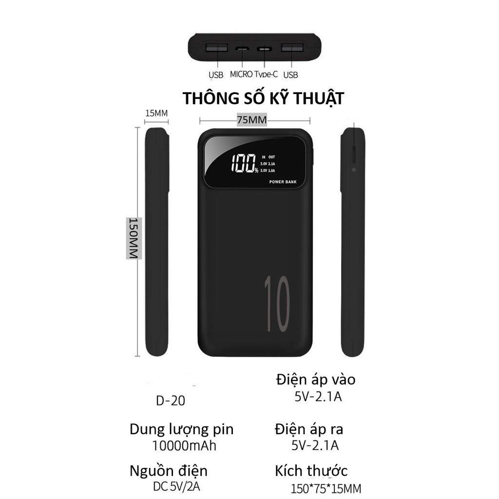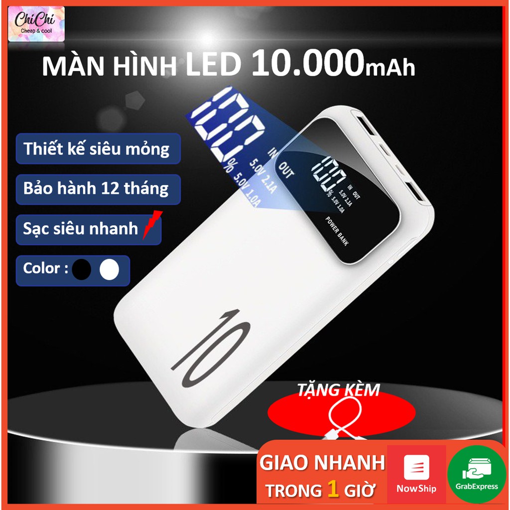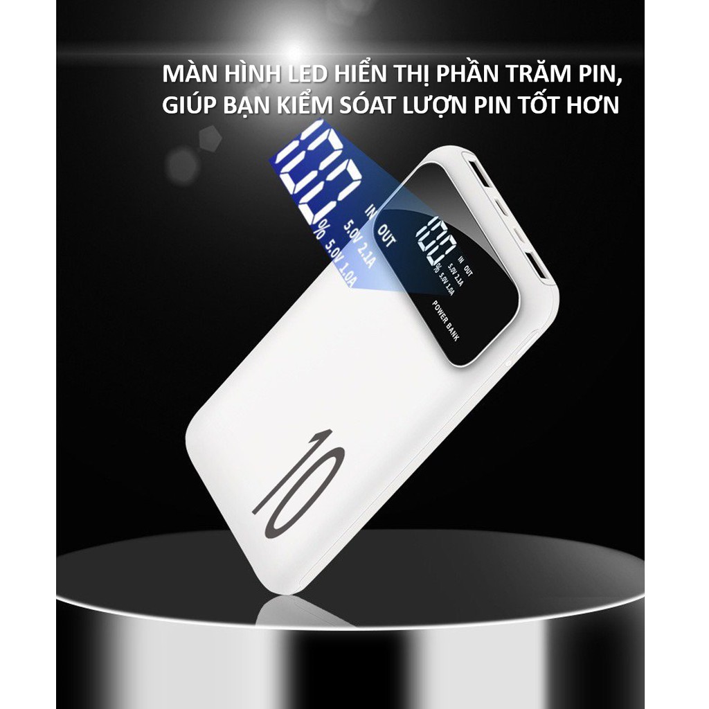 Sạc Dự Phòng 10000mAh Siêu mỏng Sạc nhanh màn hình led hiển thị phần trăm pin📱Lõi pin dự phòng Lithium Polymer 10.000mAh mật độ cao