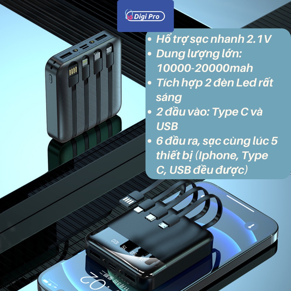 Giới thiệu Sạc dự phòng 10000 20000 mAh sạc nhanh sạc nhiều thiết bị tích hợp cáp sạc iphone, Android Micro, Type C có màn hình Led