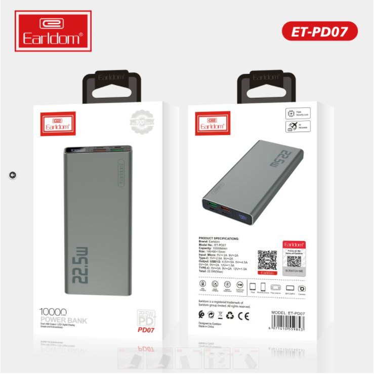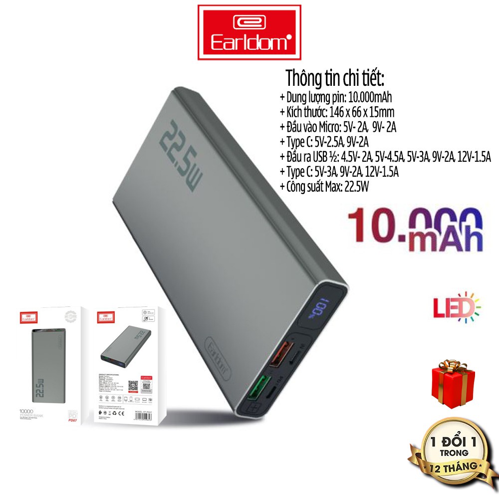 Thông tin về sản phẩm Sạc dự phòng sạc nhanh 10.000 mah earldom pd-07Với nhu cầu sử dụng sạc dự phòng ngày càng lớn, hãng đồ chơi công nghệ và phụ kiện điện thoại earldom việt nam xin giới thiệu đến khách hàng sản phẩm sạc dự phòng earldom 10.000 mah pd – 07