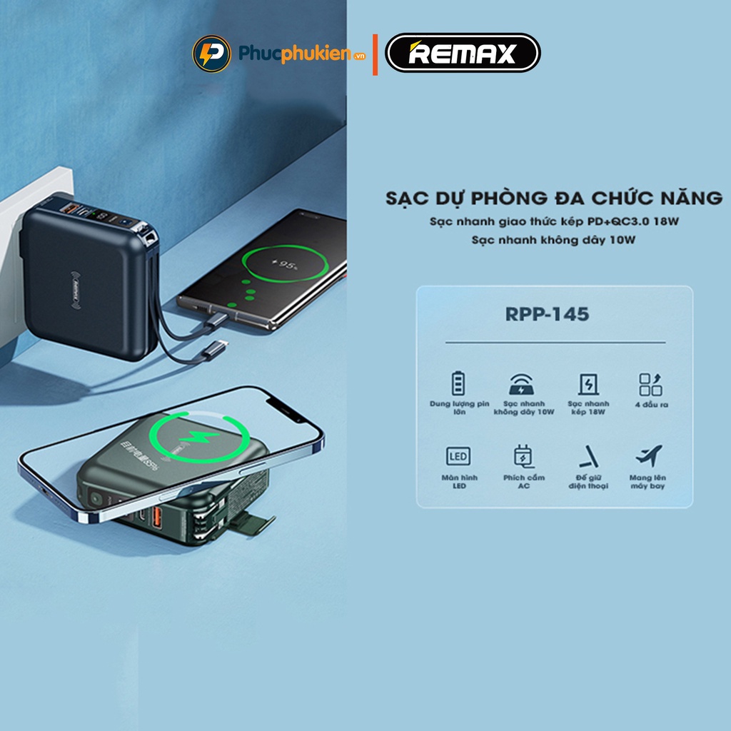 Sạc dự phòng 10000mah chính hãng Remax RPP 145 hỗ trợ sạc không dây và sạc nhanh 2 chiều 18w - Phúc Phụ Kiện HCM