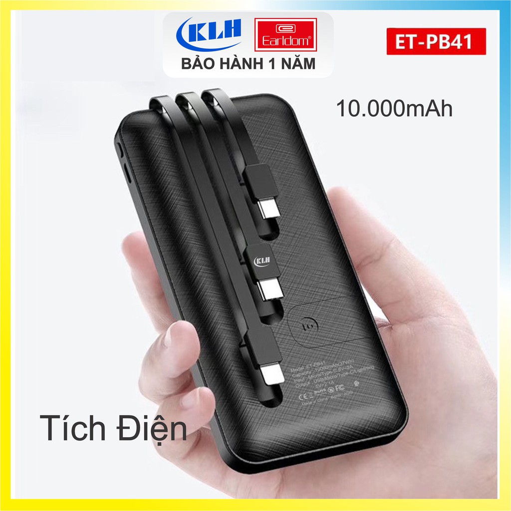 Sạc dự phòng 10000mAh Earldom PB41, pin tích điện dung lượng cao kèm 3 đầu cáp KLH shop