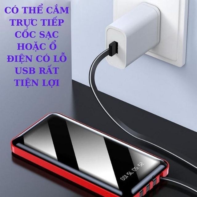 - Bạn bỏ quên dây sạc, đã có Pin sạc dự phòng Power Bank J200 có sẵn dây xếp gọn gàng trên thân máy, Sạc được cho điện thoại Iphone bằng cáp Lightning, các dòng điện thoại cũ và mới Samsung, Huawai, Xiaomi, Vivo, Oppo qua cổng sạc Micro và Type C,... có thể sạc cùng lúc 4 điện thoại với 4 dây sạc và 1 cổng USB cho dây sạc ngoài.