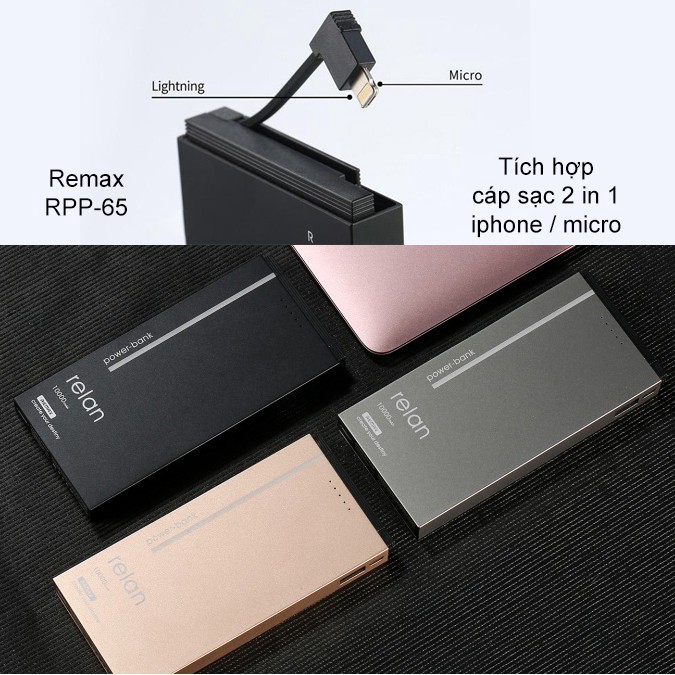 Giới thiệu Sạc dự phòng 10000mAh tích hợp cáp 2 trong 1 Remax RPP - 65 / Có Gắn Kèm Sẵn Dây Sạc
