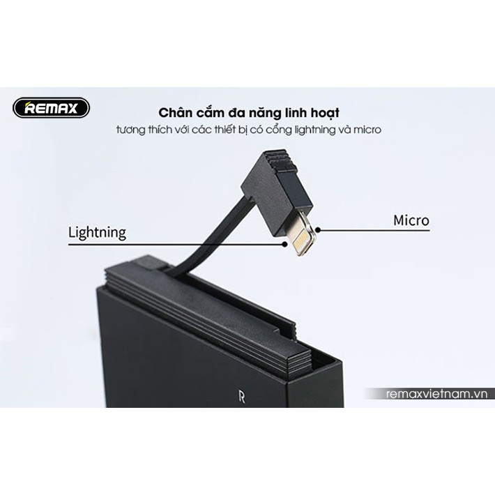 Cạnh trên cùng của pin dự phòng Remax RPP – 65 được thiết kế với cáp 2 trong 1: lightning và micro usb.Thiết kế thông minh dây sạc có thể gắn gọn vào pin, tiện lợi khi sử dụng, đồng thời cũng tạo được nét độc đáo cho sản phẩm.