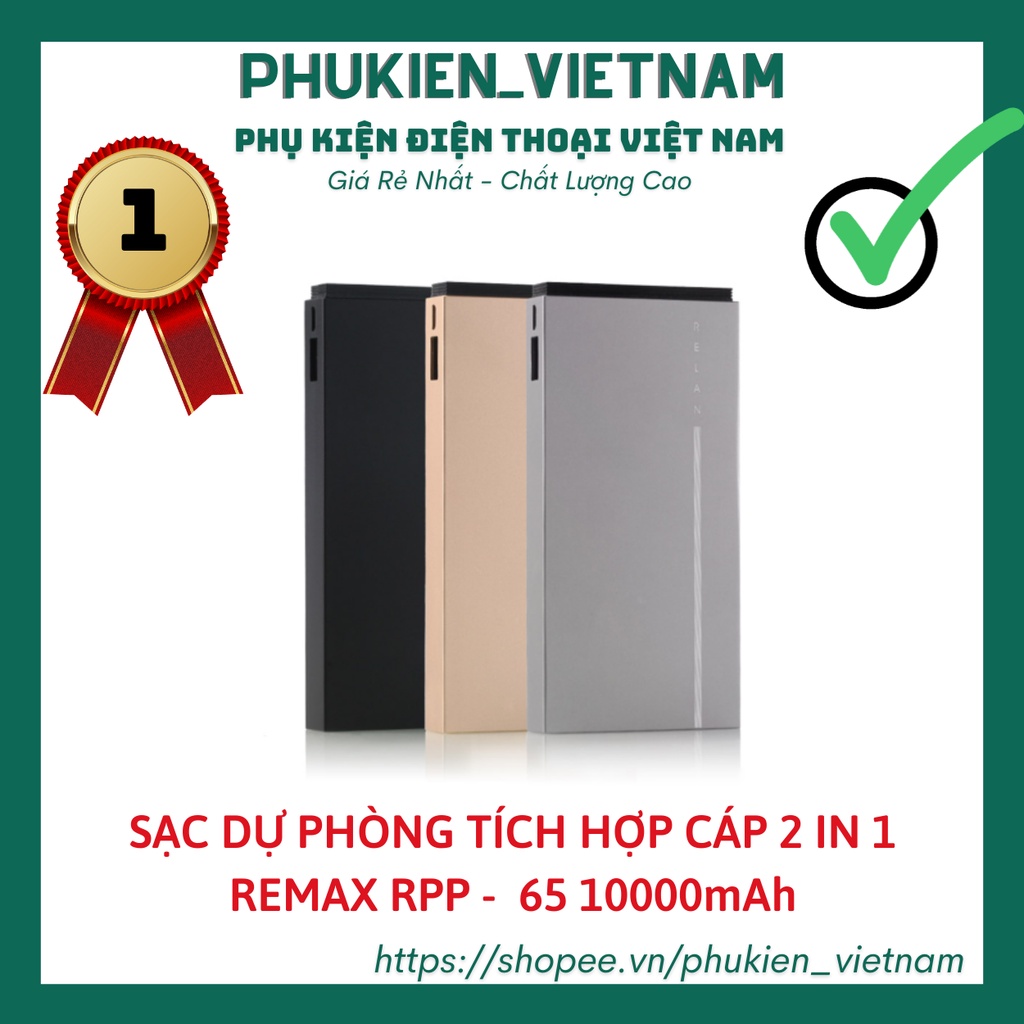 Sạc dự phòng 10000mAh tích hợp cáp 2 trong 1 Remax RPP - 65 / Có Gắn Kèm Sẵn Dây Sạc