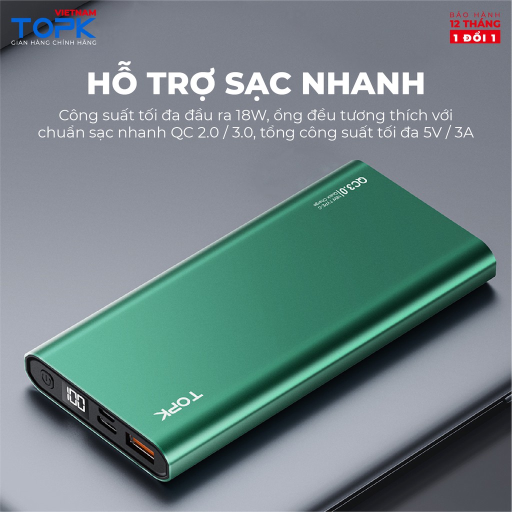 Sạc dự phòng 10000mAh TOPK I1006 - Đầu ra USB sạc ổn định - Màn hình LED - Hàng chính hãng Bảo hành 12 tháng 1 đổi 1