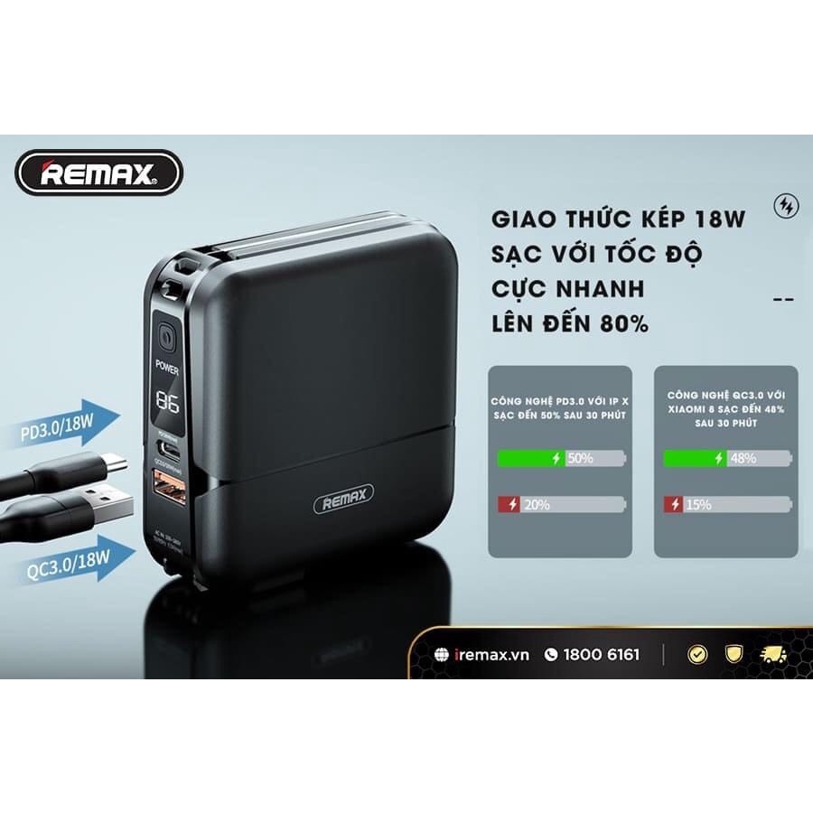 ✪ Với thiết kế tích hợp 2 trong 1, Củ sạc kiêm pin sạc dự phòng Remax 15.000mAh đóng vai trò vừa là củ sạc, vừa là chiếc pin sạc dự phòng tiện ích để bạn có thể mang theo bên mình bất cứ khi nào.