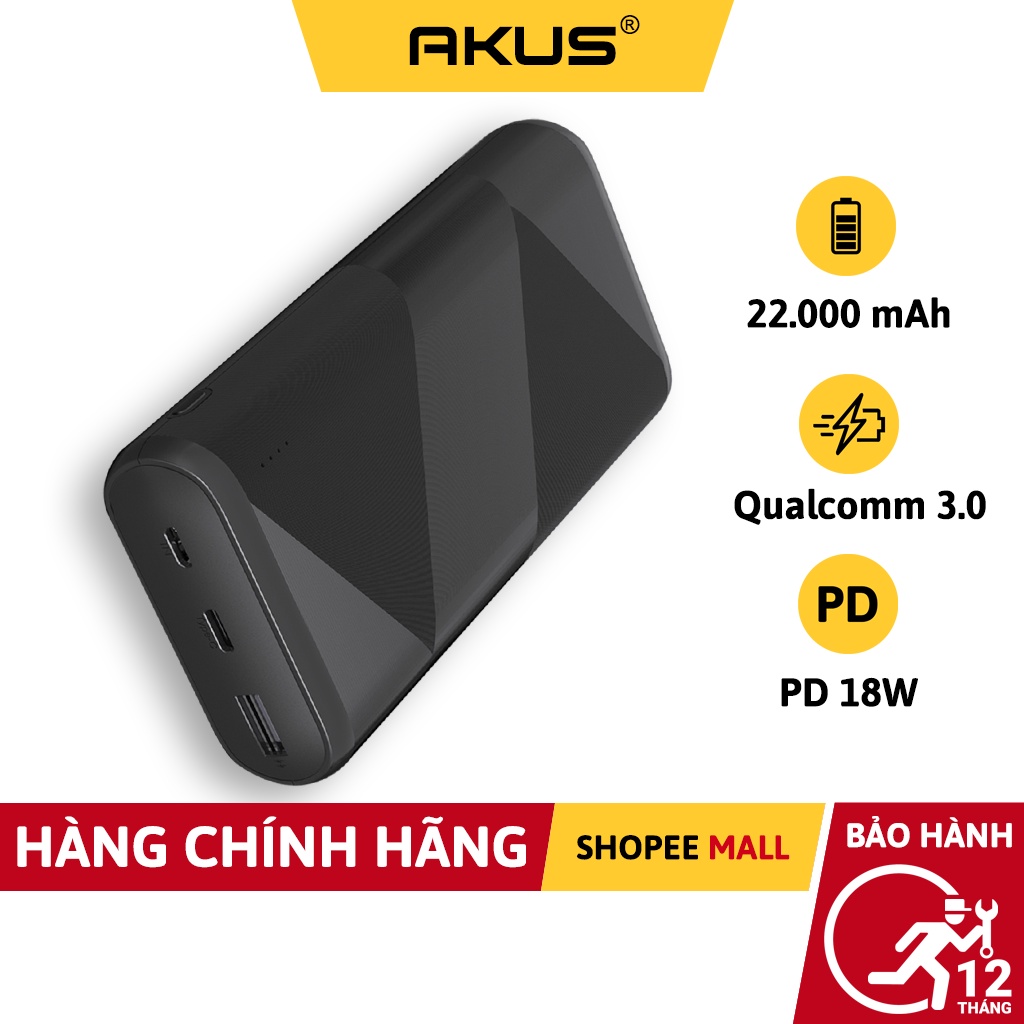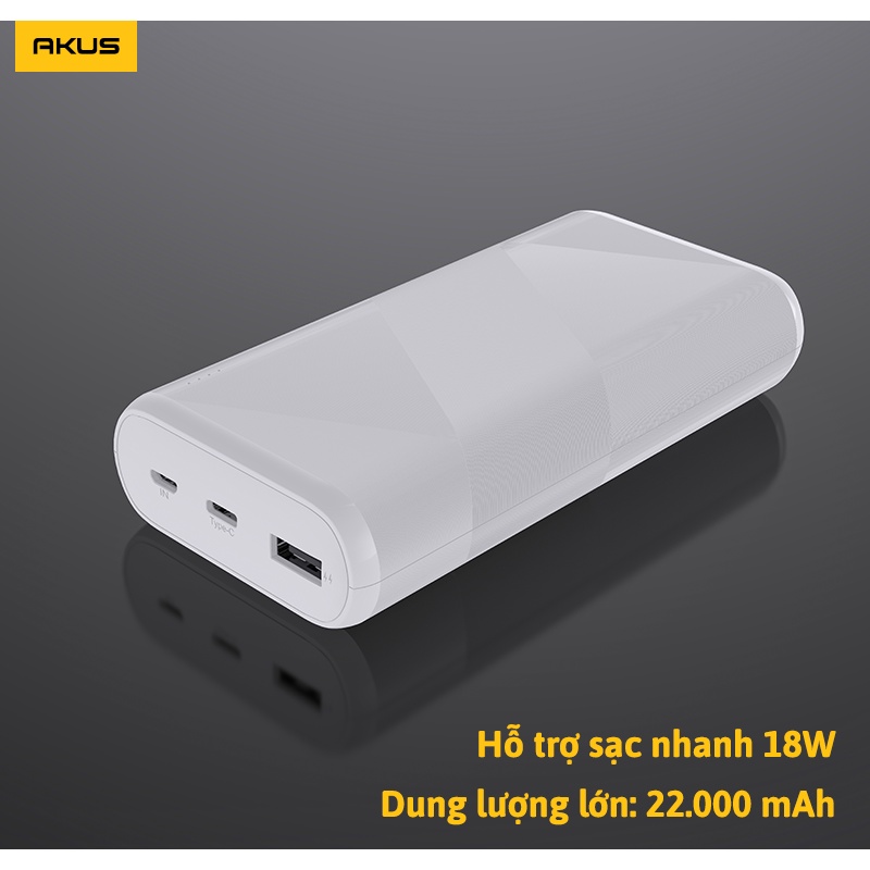 Sạc dự phòng 20000 mAh Sạc Nhanh PD 18W, Quick Charge 3.0 - A22 LUX Hàng chính hãng - Bảo hành 12 tháng - Akus
