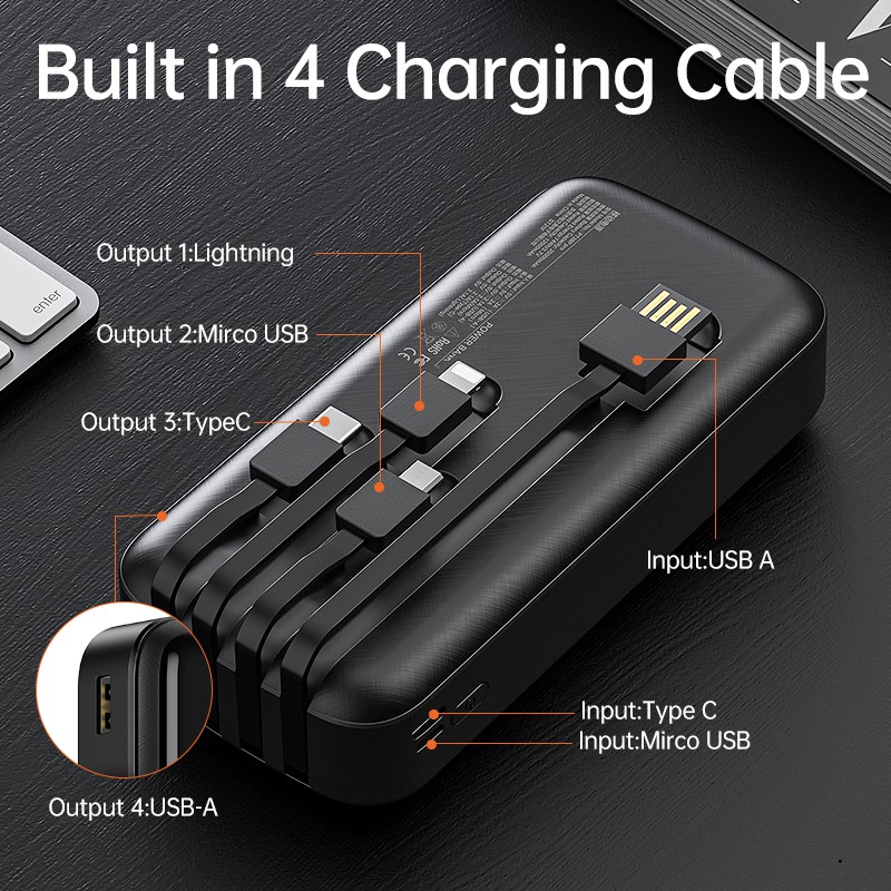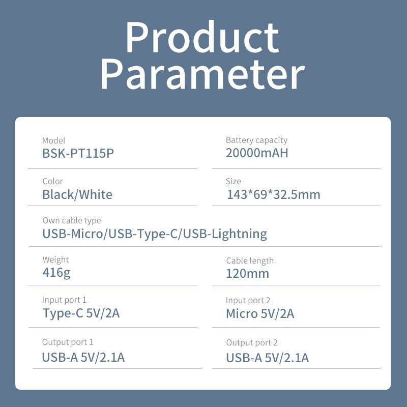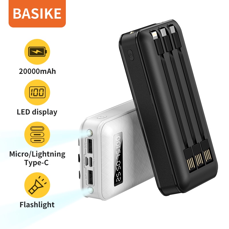 ✔️Sạc Dự Phòng 20000mAh BSK-PT115P đi kèm với cáp sạc Micro / Type-C / Lightning có thể tháo rời với đèn pin, đa chức năng