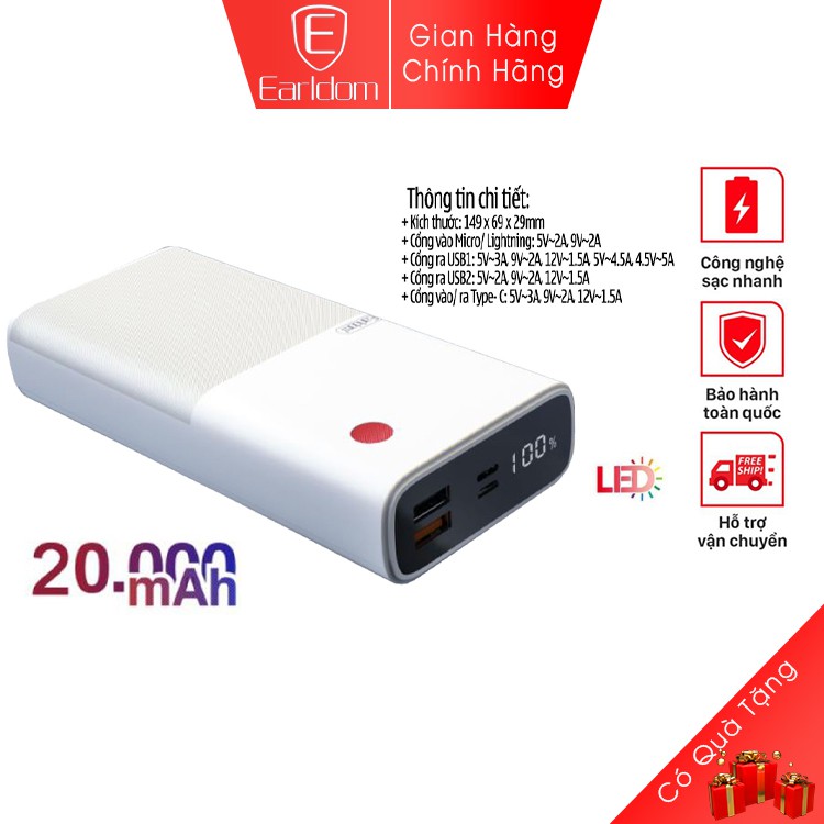 Điện Thoại & Phụ Kiện > Phụ kiện > Sạc dự phòng & Pin > Sạc dự phòng || Sạc dự phòng 20000mAh Earldom PD-05, pin sạc dự phòng dung lượng lớn rất bềnCòn hàng