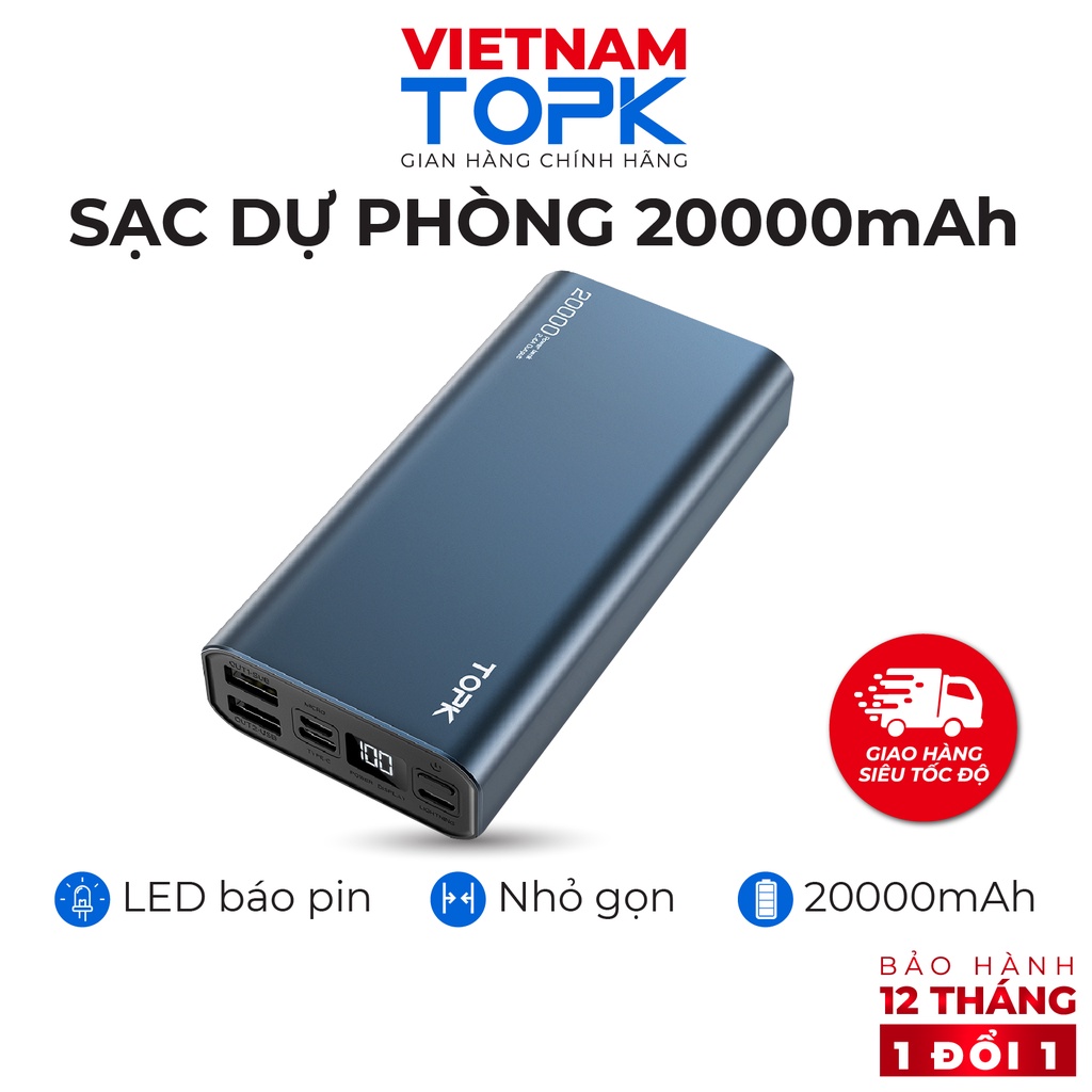 Sạc dự phòng 20000mAh TOPK I2006 Màn hình LED - 2 cổng ra - Hàng phân phối chính hãng - Bảo hành 12 tháng 1 đổi 1