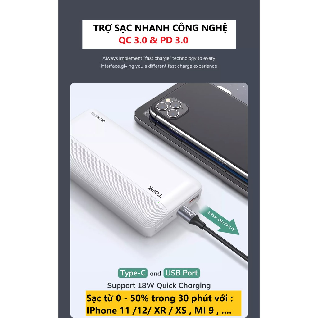 ✅ TOPK đã giành được siêu giải thưởng Thương hiệu có ảnh hưởng nhất năm 2020 tại thị trường Đông Nam Á. TOPK chuyên về các sản phẩm điện tử tiêu dùng, hầu hết các phụ kiện điện thoại.► Sạc nhanh 18W PD3.0 + QC 3.0: Cổng USB-C cấp nguồn nhanh hai chiều, hỗ trợ cấp nguồn lên đến 18W đầu vào và đầu ra. Đầu ra QC 3.0 hỗ trợ 5V / 3A, 9V / 2A, 12V / 1.5A. Bạn có thể sạc 2 điện thoại cùng lúc, sạc nhanh các thiết bị của bạn trong ngay cả khi sử dụng cả 2 đầu ra cùng một lúc (Tối đa 36W).