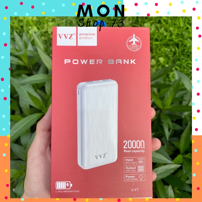 - Sạc dự phòng VVZ VY7 có dung lượng thực tối đa 20000mah, dung lượng cao có thể sạc nhiều lần cho điện thoại mà không lo hết pin.