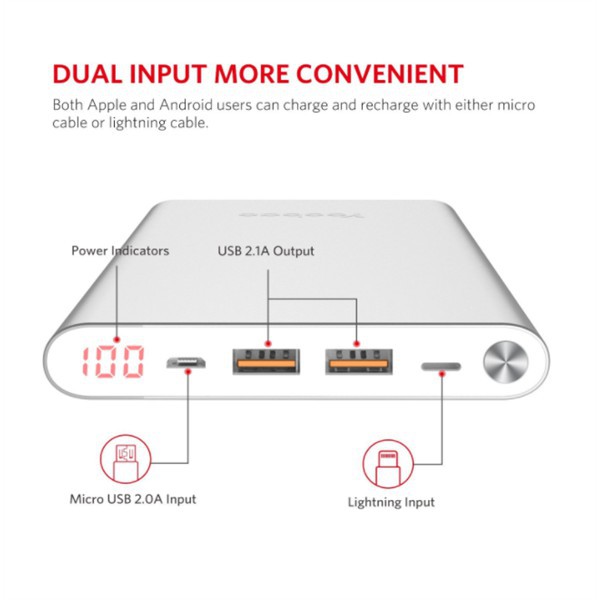 Vỏ nhôm nguyên khối rất chắc chắn, 01 nút nguồn, nhấn để sạc, 4 đèn led hiển thị chỉ số pin, mỗi đèn tương ứng 25% pin, 01 cổng USB sạc, 01 cổng vào MicroUSB