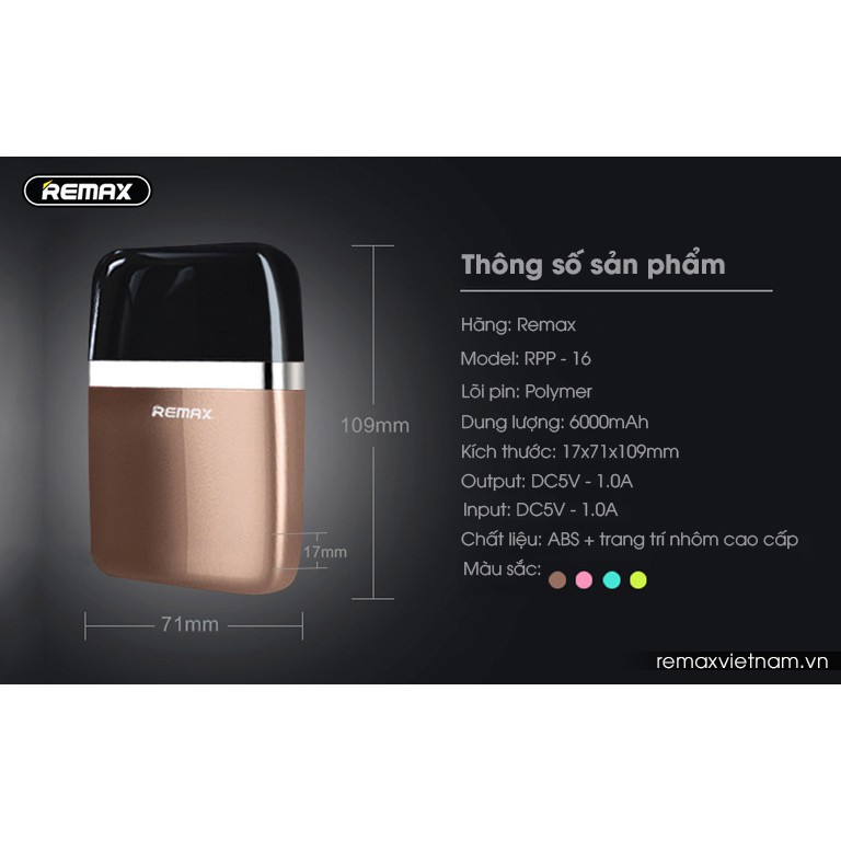 Tên sản phẩm: Pin sạc dự phòng Remax RPP - 16 6000mAhHãng: Remax