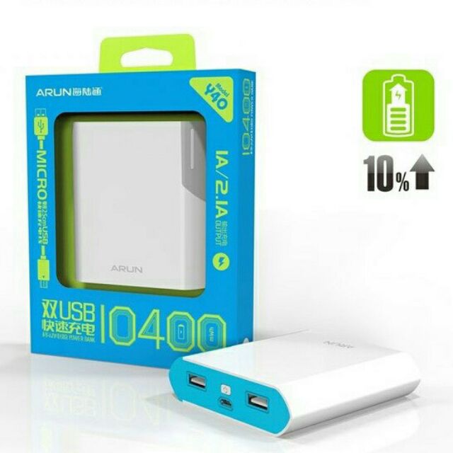 Dung lượng khủng được thiết kế với 4 viên pin Lithium – Ion cao cấp có thể lưu trữ lên đến 10400mAh, pin sạc dự phòng Arun 10400mAh có hình dáng khá hiện đại, chắc chắn, với những đường cong mềm mại, vừa cầm tay, màu sắc đa dạng, nổi bật cá tính khi sử dụng. Pin dự phòng Arun 10400mAh Pin sạc dự phòng Arun 10400mAh tích hợp bo mạch chủ được nâng cấp chất lượng toàn diện, kiểm soát điện áp hoạt động cực kỳ ổn định lên đến hơn 70%, an toàn, đạt hiệu quả cao, tự ngắt điện mỗi khi sạc đầy pin. Pin sạc dự phòng Arun 10400mAh bảo vệ và gia tăng tuổi thọ cho pin và thiết bị. Bộ sản phẩm pin sạc dự phòng Arun 10400mAh bao gồm 1 pin sạc và 1 cáp nối USB khá tiện lợi vì không có cáp dài vướng víu.02 ngõ ra USB tích hợp cổng sạc 5V – 1A và 5V – 2.1A, pin sạc dự phòng Arun 10400mAh giúp bạn sạc cùng lúc cho 02 thiết bị, nạp điện nhanh chóng mà lại tiết kiệm thời gian. Đầu ra của pin sạc được thiết kế phù hợp để sử dụng cho hầu hết các loại điện thoại di động, máy tính bảng, máy tính mini, máy nghe nhạc và các thiết bị dùng cổng sạc 5V khác. Đặc biệt, pin sạc dự phòng Arun 10400mAh, còn được trang bị hệ thống 04 đèn LED thông báo 4 mức độ tình trạng pin. Pin Sạc Dự Phòng Arun 10400mAh là người bạn đồng hành không thế thiếu của bạn trong mọi hành trình.