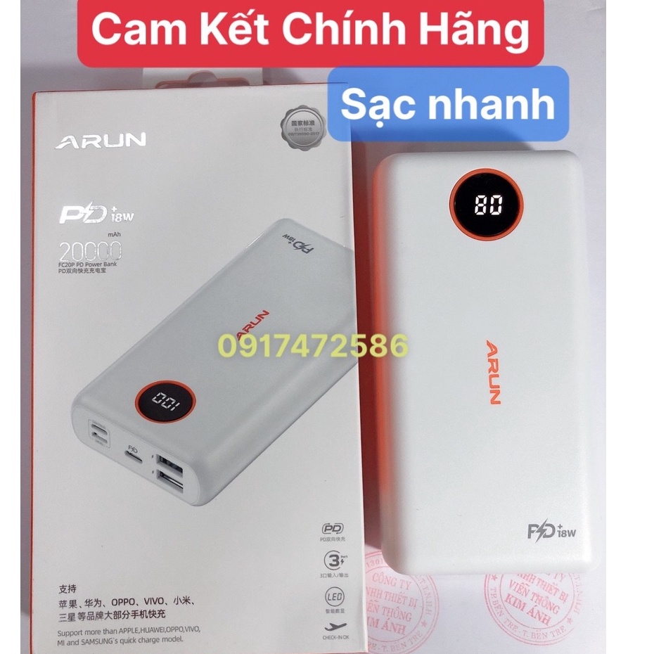 Sạc Dự Phòng Arun FC20P 20000 mAh (PD18W, QC3.0) Sạc Nhanh 2 Chiều Type C, Hàng chính hãng