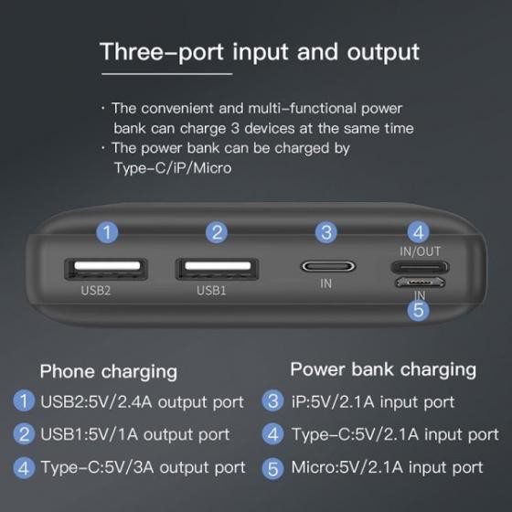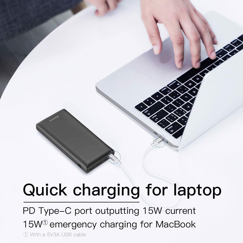Với dung lượng lớn, pin dự phòng Baseus có tới 3 cổng sạc ra, bạn hoàn toàn yên tâm vì toàn bộ thiết bị di động của bạn sẽ được sạc đầy bởi dung lượng lớn. Pin có 2 cổng ra USB-A lần lượt cho dòng sạc là 2.1A và 1.0A, tuy nhiên điều đặc biệt hơn cả là cổng Type-C có hỗ trợ PD ở 15W, sạc nhanh cho iphone 8 trở lên, và duy trì nguồn điện lý tưởng cho macbook.