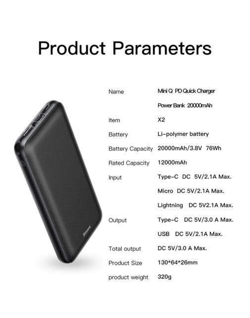 Sản phẩm sử dụng công nghệ pin Li-Polymer thế hệ thứ 3 tiên tiến nhất , cho hiệu năng sử dụng cao hơn . Pin dự phòng dung lượng lên đến 20,000mAh trong khi kích thước chỉ tương đương với các dòng pin 10,000mAh khác trên thị trường .- Pin sạc dự phòng Baseus Mini Q PD với bề mặt làm bằng Carbon ABS+PC , thiết kế dạng sọc ca rô nhỏ vừa tạo vẻ đẹp sang trọng vừa giúp chống bám vân tay tốt hơn. Thiết kế bo tròn ở 4 cạnh và mép cho cảm giác cầm thoải mái và chắc tay hơn.