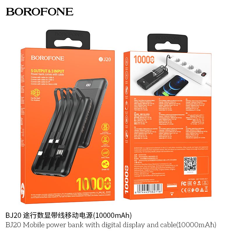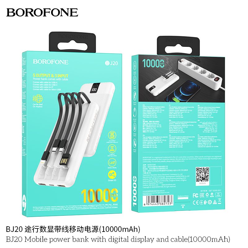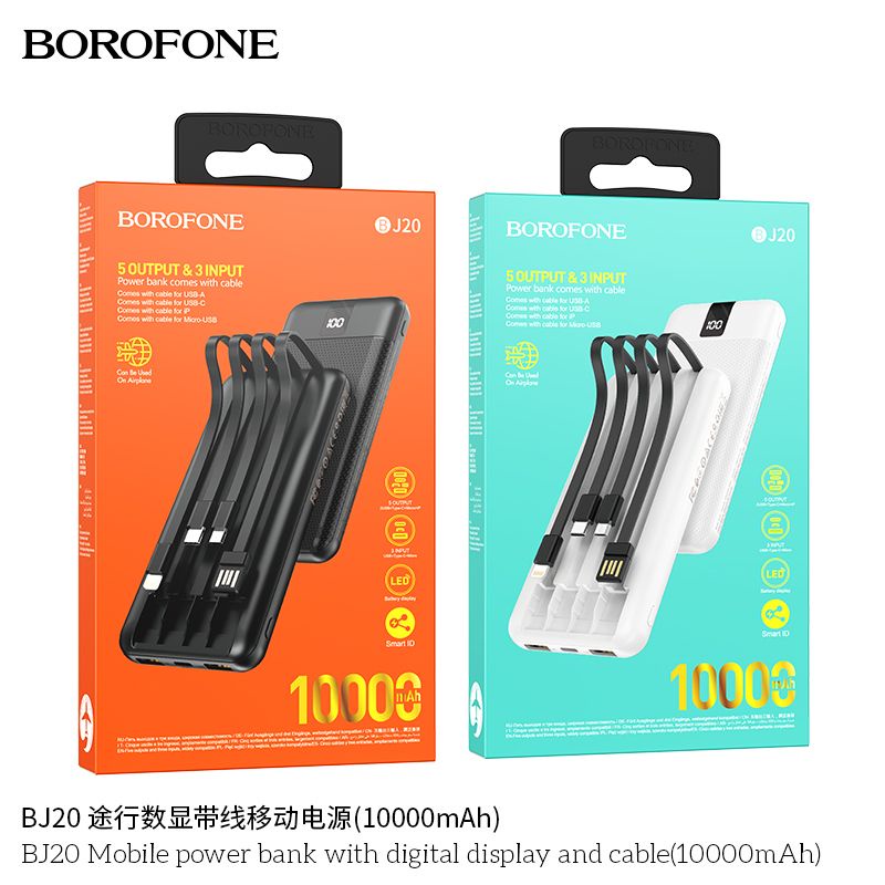 Pin sạc dự phòng Borofone BJ20 10.000mAh tích hợp kèm 3 dây cổng Lightning/TypeC/Micro - chính hãng chất lượng cao, phụ kiện phượt, du lịch