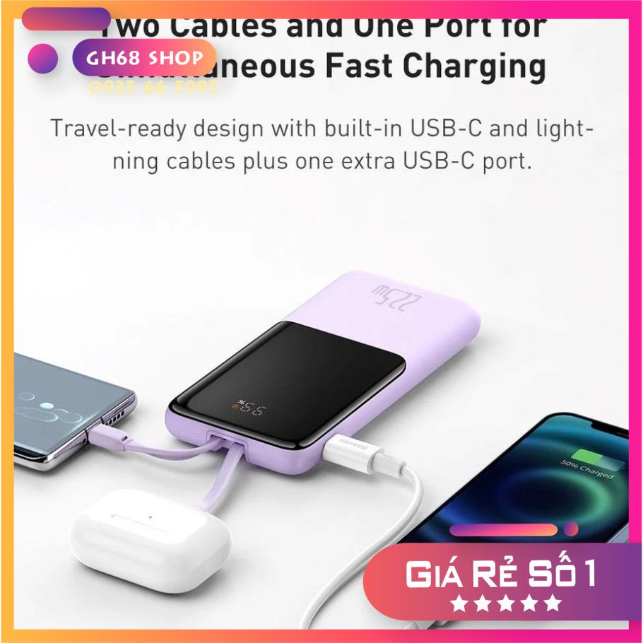 Pin sạc dự phòng 10.000mAh hỗ trợ sạc nhanh 22.5W hiệu Baseus Elf Digital Display kèm dây lightning & Type-C với 1 cổng Type-C sạc ra và 2 dây sạc Type-C và lightning giúp bạn sạc đồng thời 3 thiết bị khác nhau, nó tương thích hầu hết mọi thiết bị di động mà bạn biết.