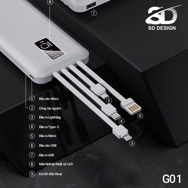 Giới thiệu Sạc dự phòng chính hãng SD DESIGN G01 dung lượng 10.000 mAh có đầy đủ chân sạc cho iphone, samsung, xiaomi,...