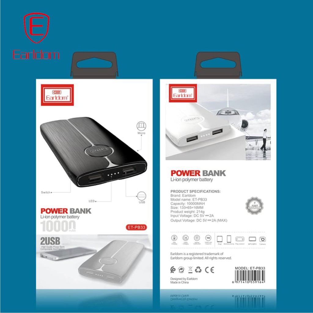 Giới thiệu Sạc dự phòng công nghệ Pin Li-ion, độ bền cao 10.000mAh Earldom ET-PB33
