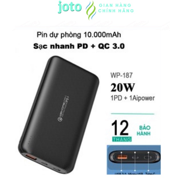 Pin sạc dự phòng 20000mAh WP-189 có dung lượng lớn, với 2 cổng sạc tiện lợi giúp bạn nạp đầy năng lượng cho các thiết bị điện thoại một cách nhanh chóng và tiện lợi.