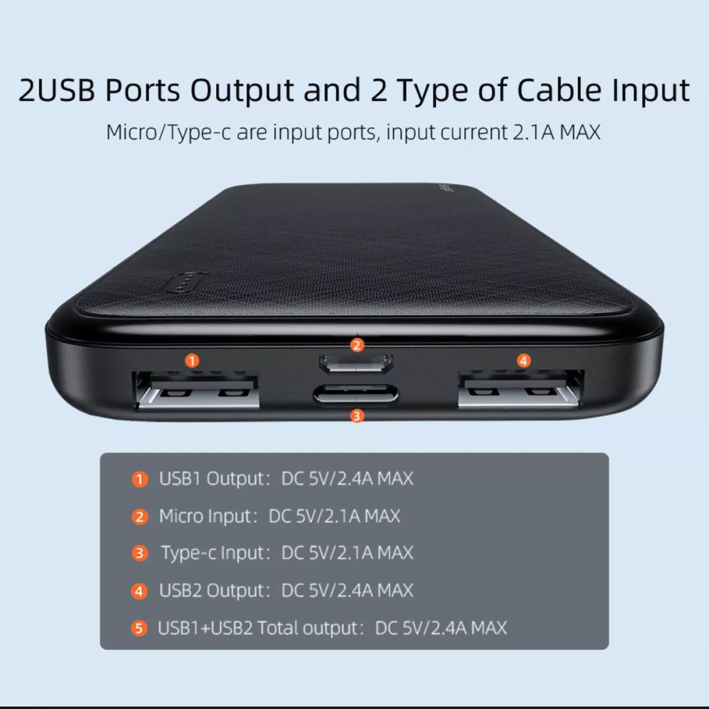 Chất liệu: ABS + PC, Màu: Đen, Trắng, Đầu ra USB kép: 5V / 2.1A, 5V / 1A, Đầu vào Micro + Loại C: 5V / 2A