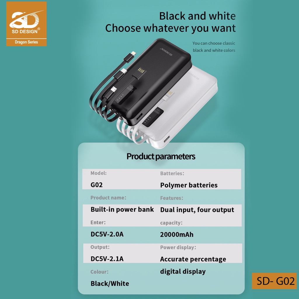 Sạc dự phòng G02 4 cổng chính hãng SD DESIGN dung lượng 20.000 mAh với đầy đủ chân sạc cho iphone, samsung, xiaom➖ Chính sách bảo hành: