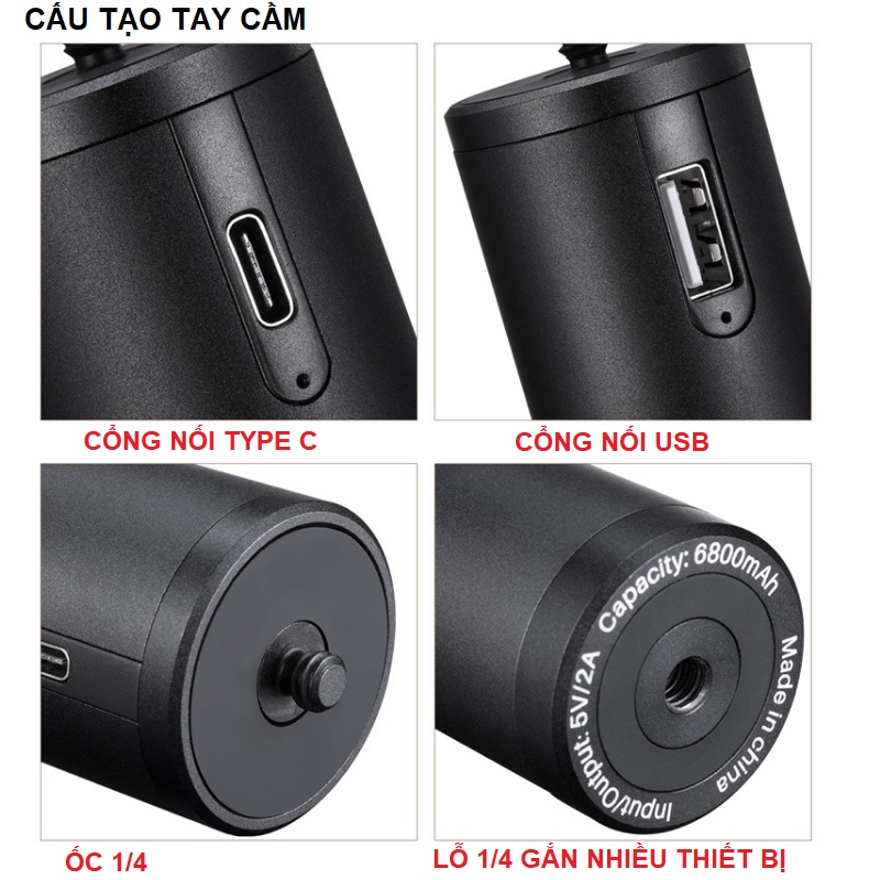 - Tay cầm có ốc và vít 1/4 phù hợp gắn nhiều thiết bị như tripod, đèn....