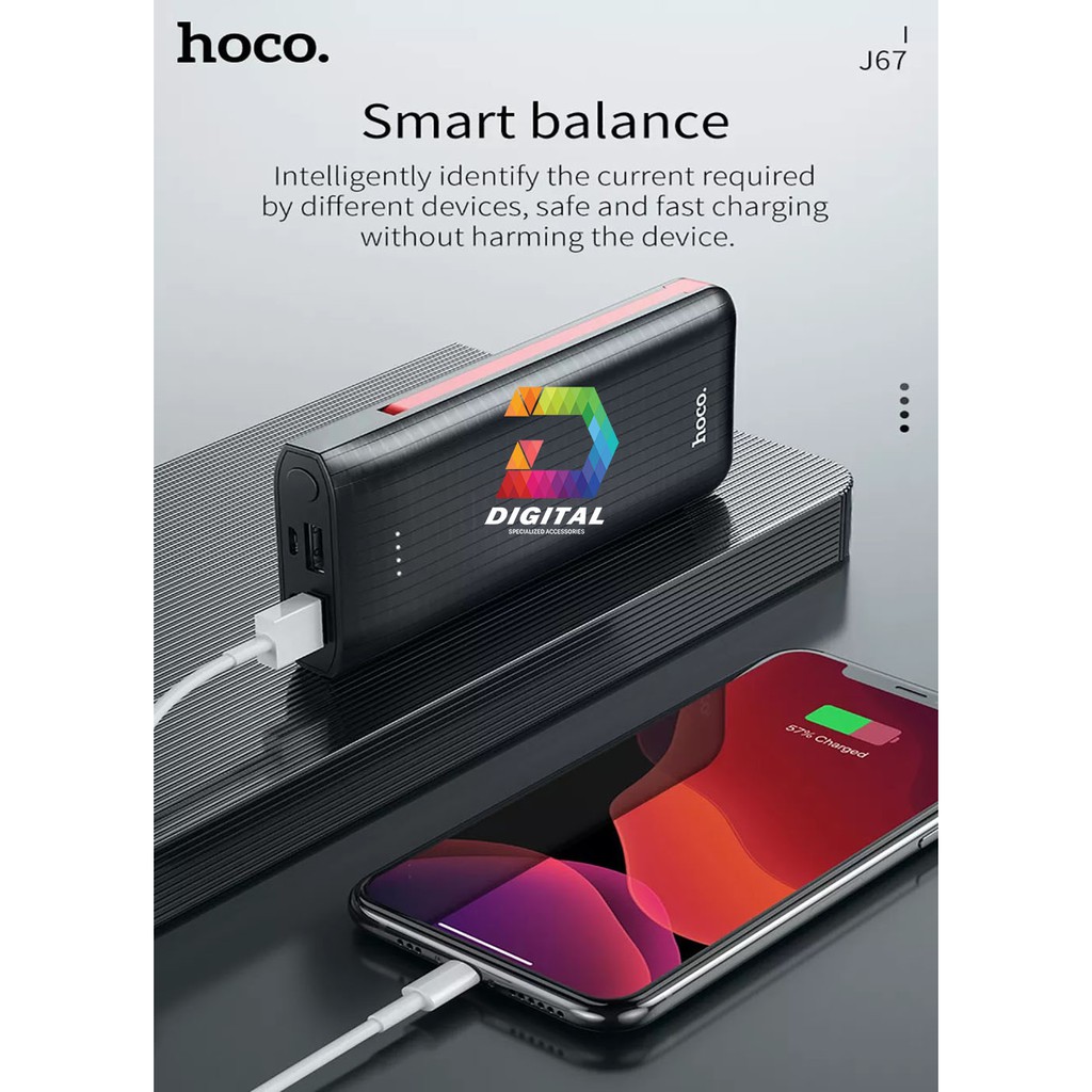 - Kiểu dáng nhỏ nhắn, gọn nhẹ Sạc dự phòng đa năng Hoco J67 có kích thước thước chỉ 131 * 60 * 23mm.Dung lượng 10000mAh cùng với 2 dây cáp sạc.