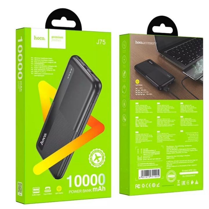 Pin sạc dự phòng di động Hoco J75 Tresor 10000mAh, đầu vào Micro-USB / Type-C, đầu ra USB 2A kép, với màn hình đèn Led báo dung lượng pin.