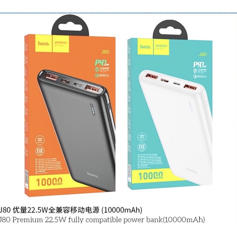 Sạc dự phòng Hoco J80 hỗ trợ sạc nhanh công suất PD20W siêu tốc, dung lượng 10000mAh, công suất tiêu thụ khi sạc đạt 70%, có thể sạc đầy từ 2-2,5 lần cho điện thoại dung lượng pin 3000mAh (như iPhone XS Max hoặc Samsung S10 Plus) tích hợp 2 cổng ra USB, 2 cổng vào MicroUSB và Type C để cắm điện cho SDP này, trên J80 có đèn báo hiển thị vạch pin. J80 sạc cho tất cả các thiết bị điện thoại Smartphone và máy tính bảng