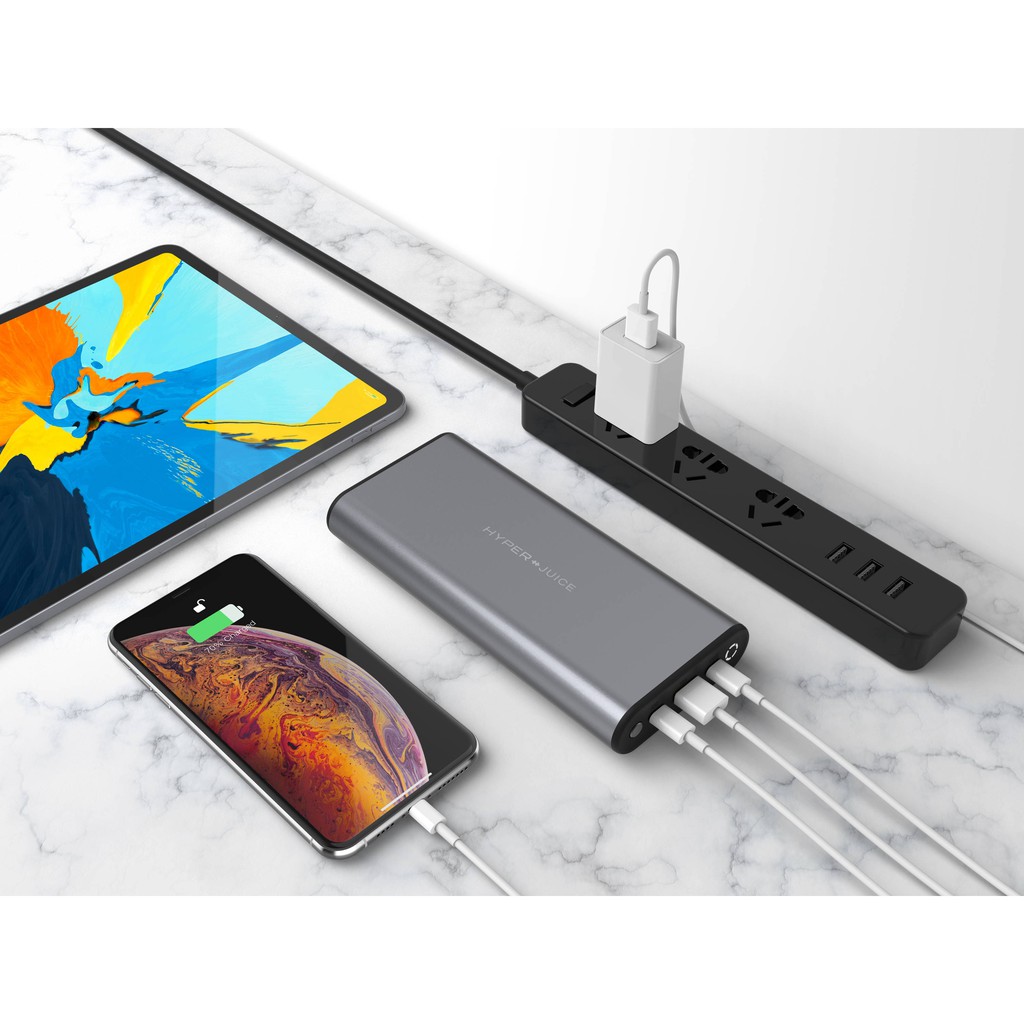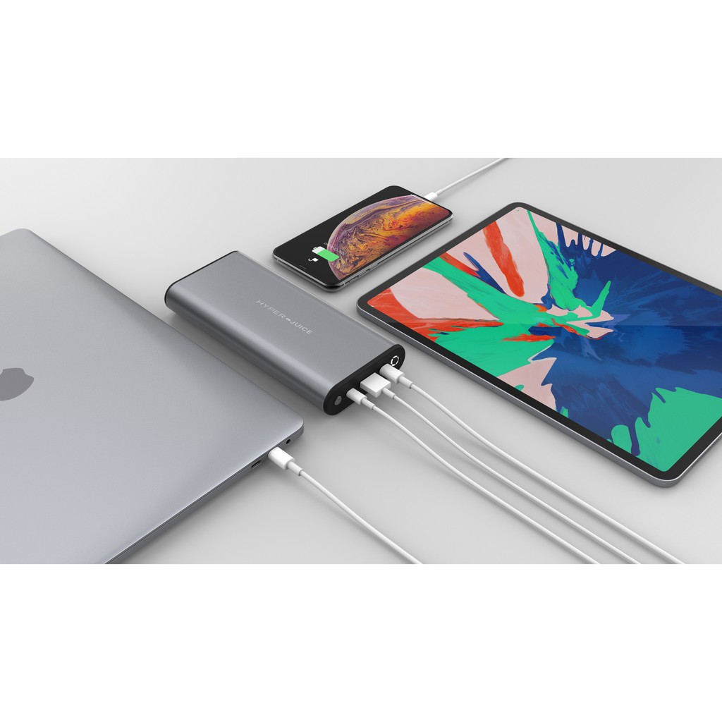 – HyperJuice có thể sạc nhanh một máy tính xác tay lớn (Macbook Pro 15”), 1 máy tính xách tay (Macbook Pro 13”, Macbook 12”, iPad Pro 12,9”) cùng 1 lúc. Hoặc có thể sạc 1 chiếc Macbook Pro 13”, 1 iPad Pro 12,9” và 1 chiếc Smartphone cùng 1 lúc.