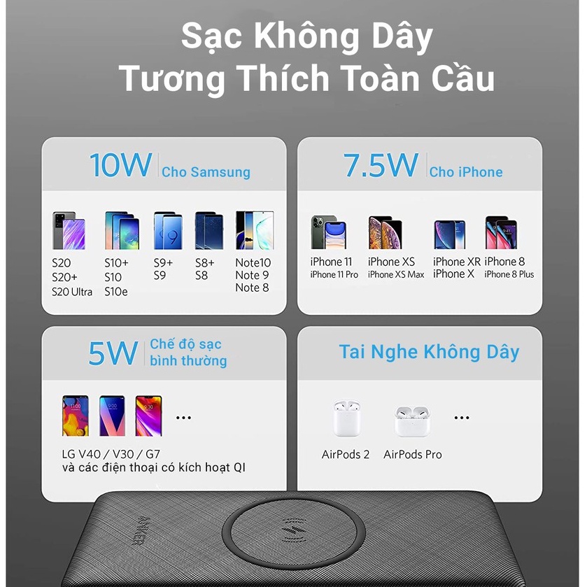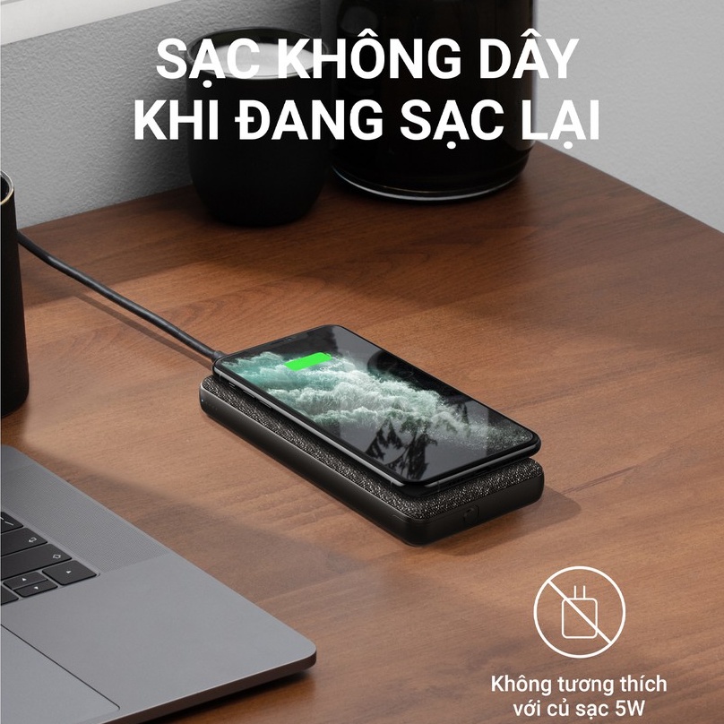⚠ Không sử dụng bộ sạc 5W để sạc không dây điện thoại và sạc lại PowerCore đồng thời. Để sạc đồng thời ở tốc độ tối đa, bạn nên sử dụng bộ sạc có đầu ra ít nhất 18W.