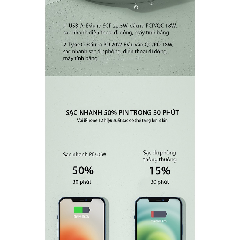 + Công nghệ sạc nhanh 20W với khả năng sạc nhanh gấp 300% các loại sạc pin dự phòng thông thường ( Sạc nhanh 50% trong 30 phút với iPhone 12 )