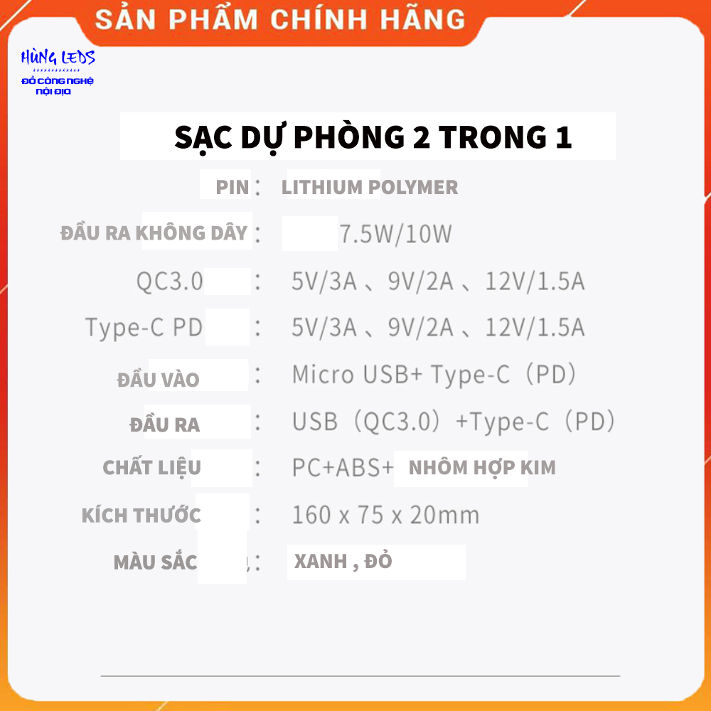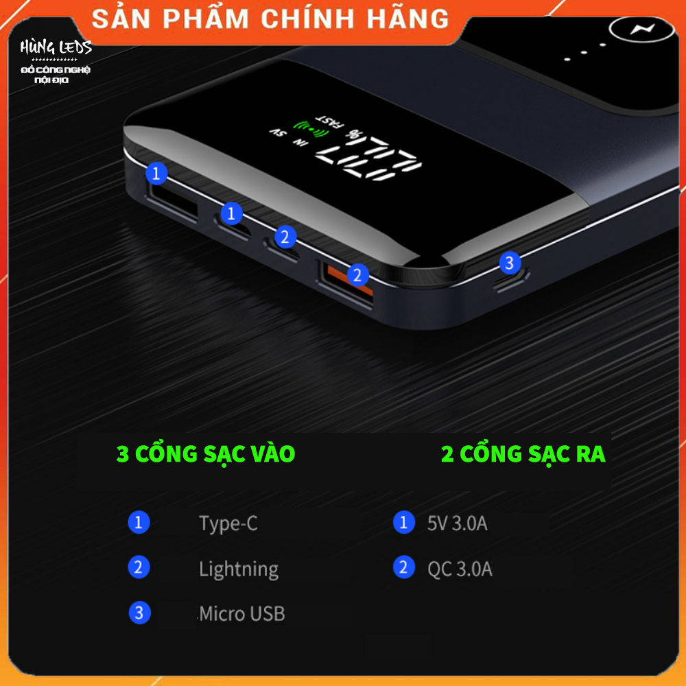 không dây: [20000x3,7 ] x 0,9 / 5 = 13300Mah . QC3.0 5V/3A , 9V/2a, 12V/1.5A