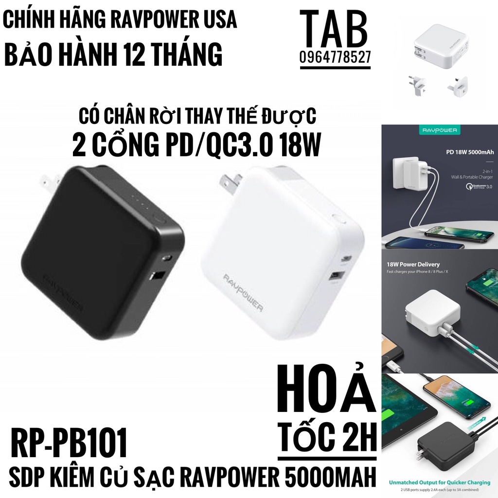 ⭐️Sạc Dự Phòng Kiêm Củ Sạc RavPower 5000 18w Có PD/QC3.0 - Chính Hãng (RP-PB101)✅ Model: RP-PB101