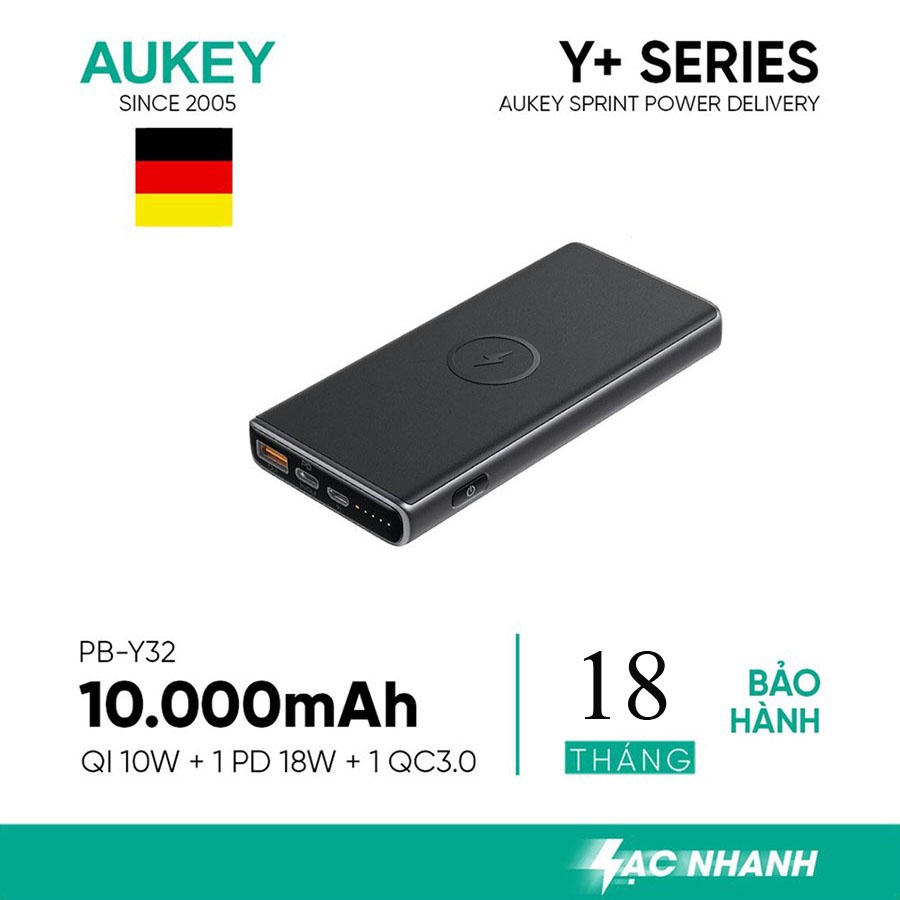 Sạc dự phòng kiêm sạc không dây 10W AUKEY PBY32 10.000MAH, sạc nhanh PD 18W, QC 3.0